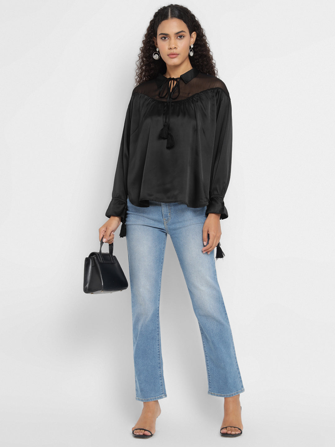 Porsorte Black Satin Tie-Neck Yoke Long-Sleeve Top for Party & Evening Wear