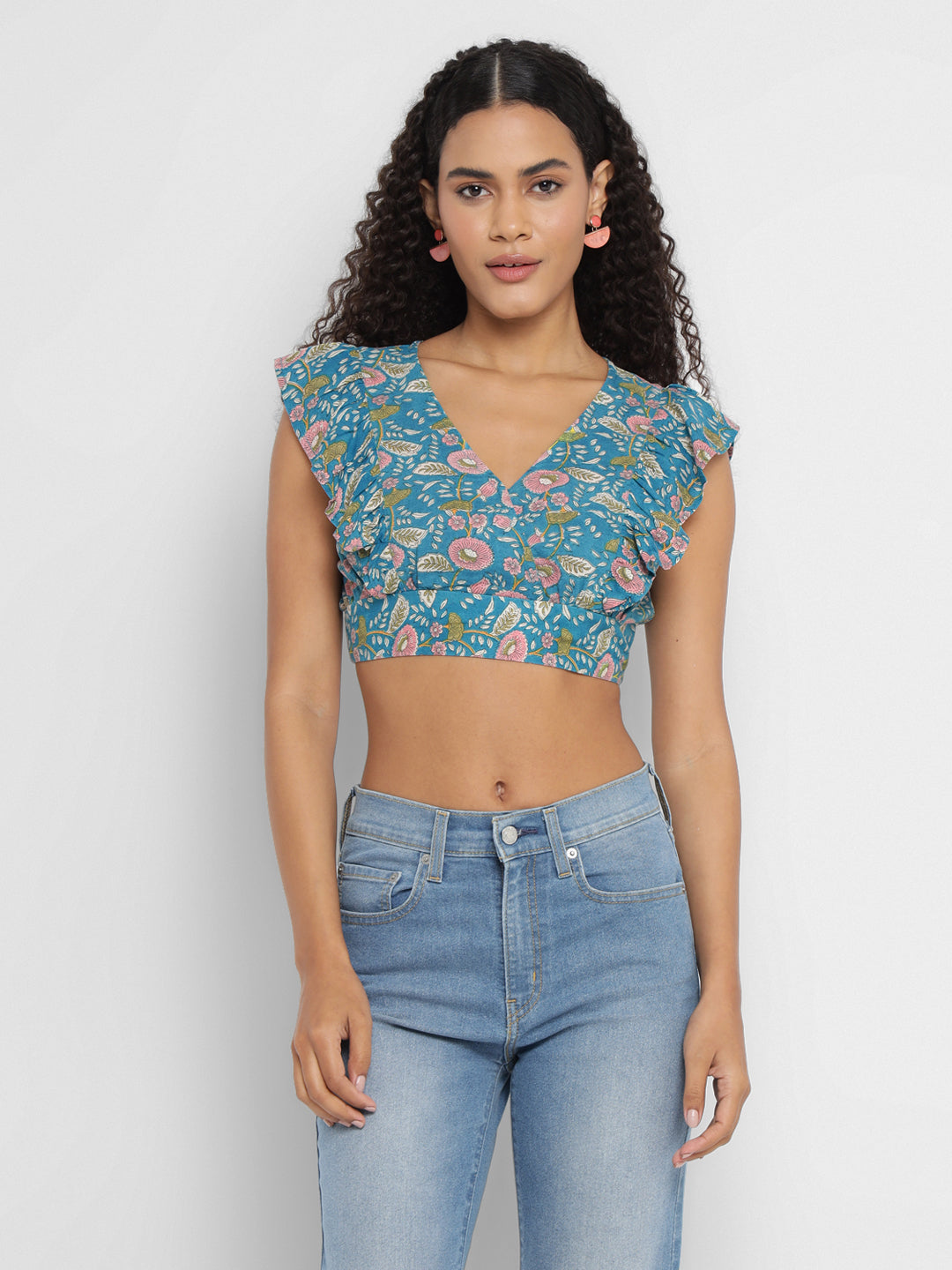 Porsorte Womens Blue Floral Printed Rayon Crop Top with Ruffled Sleeves