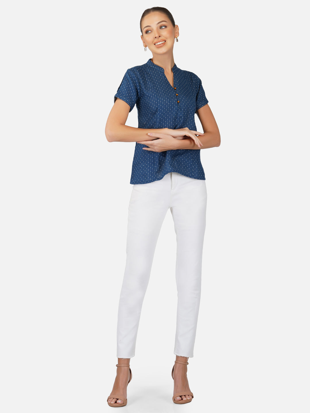 Porsorte Womens Cotton Gauze Blue Dot Print Pan Collared Shirt Top