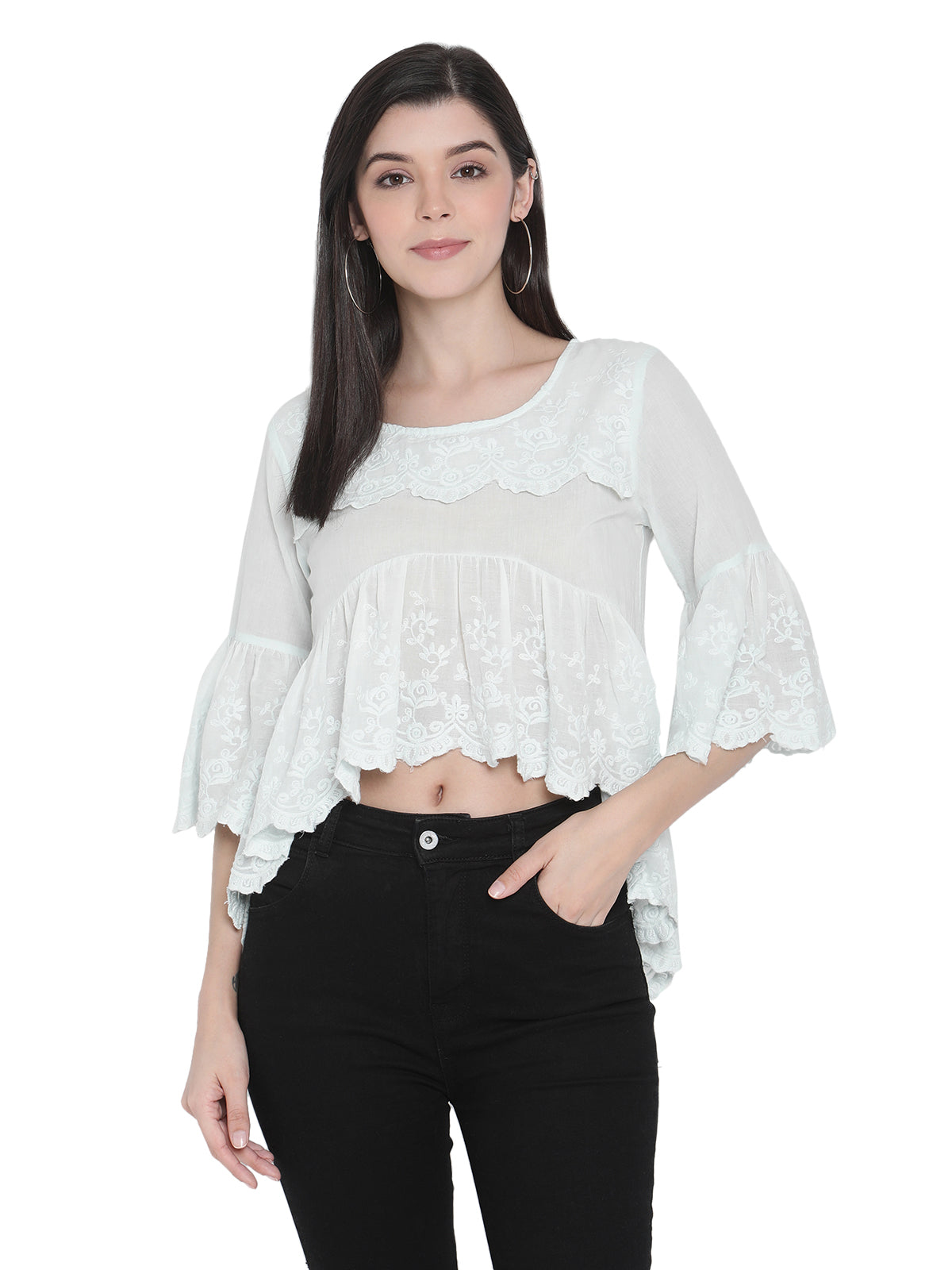 Porsorte Womens Cotton embroidery Bell Sleeve Light Blue Top