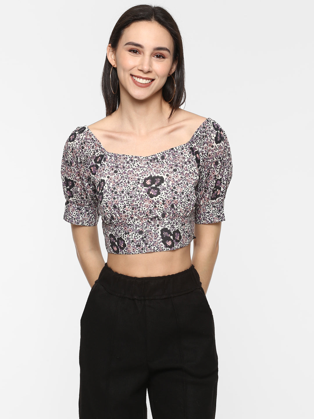 Porsorte Women Purple Cotton Printed Smocked Crop Top