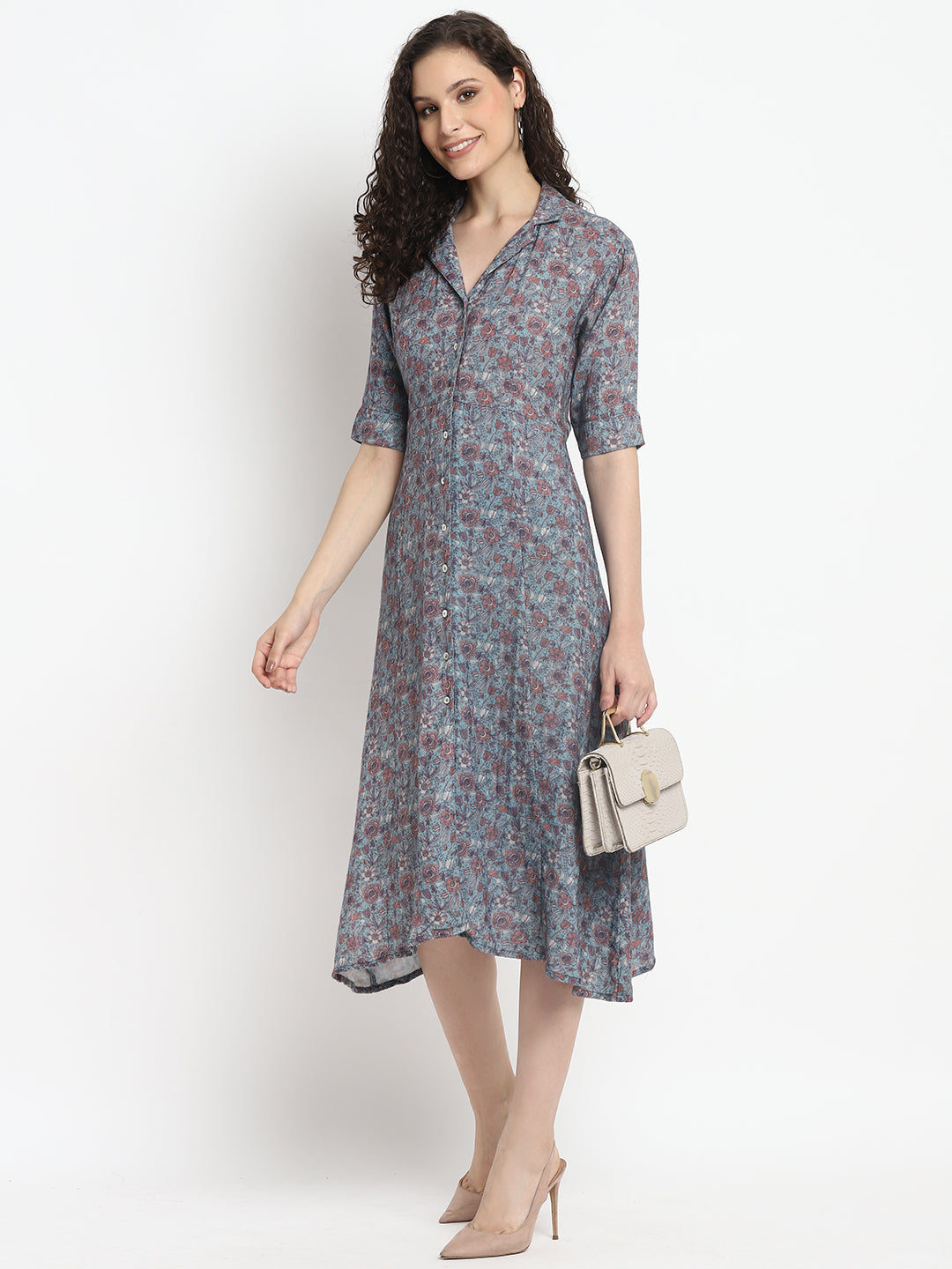 Porsorte Womens Ditsy Print Blue Puff Sleeve Midi Dress