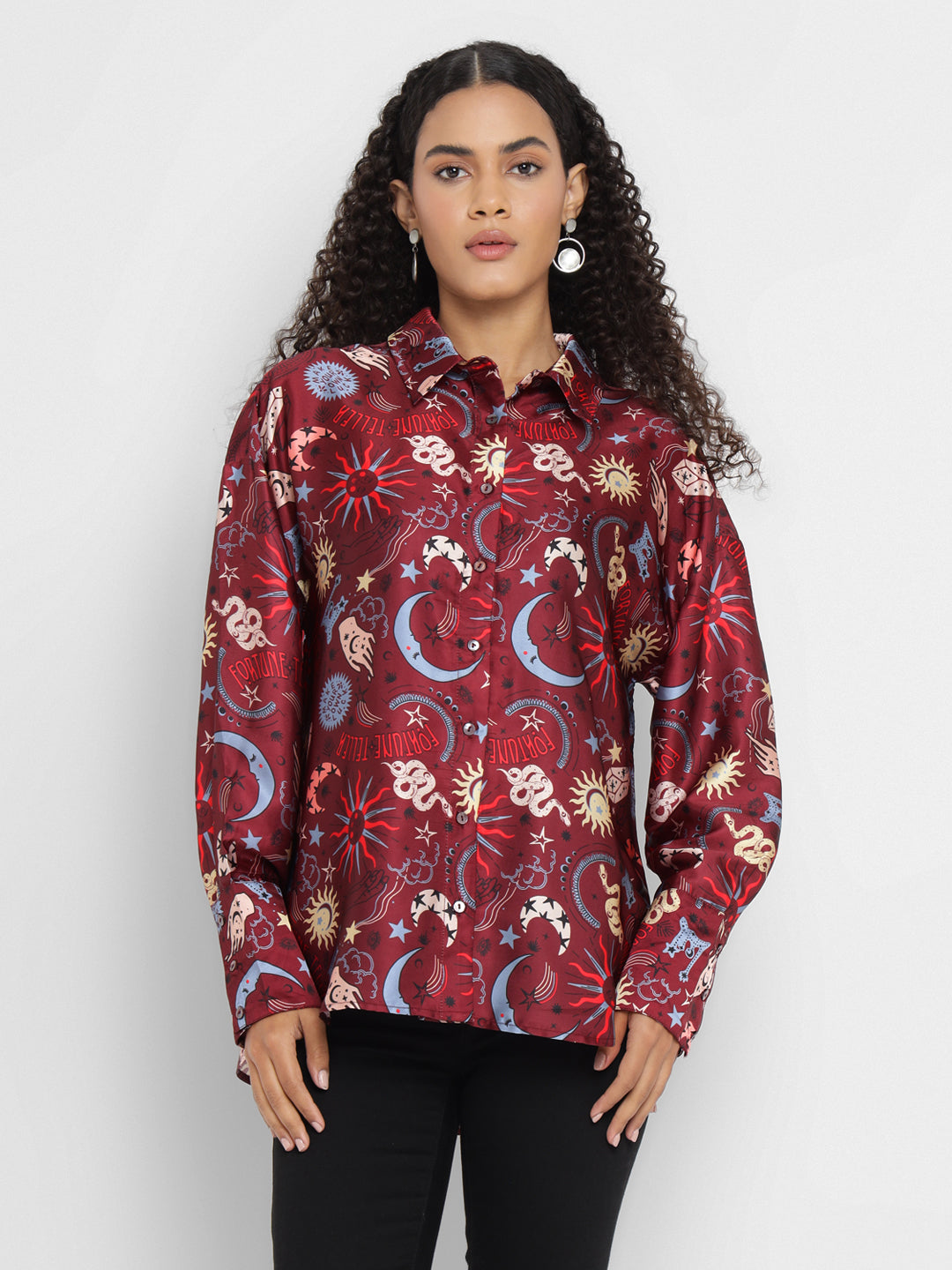 Porsorte Women’s Maroon Satin Printed Full Sleeves & Button-Down Collar Shirt