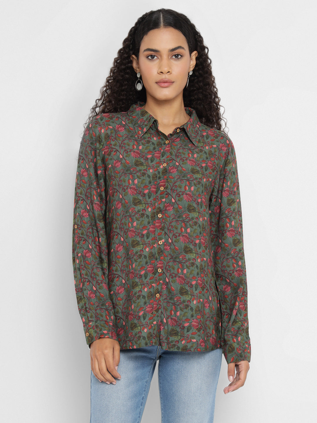 Porsorte Women’s Green Floral Printed Full Sleeves, Button-Down Collar Shirt