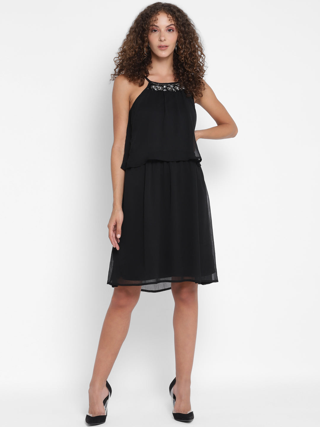 Porsorte Women Black Chiffon Sequins and Studs Embellished Halter Neck Shift Dress