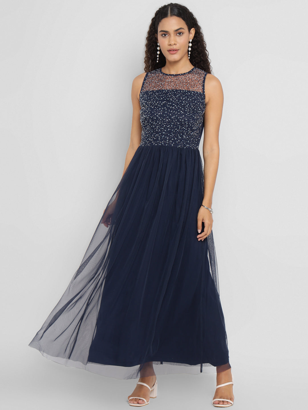 Porsorte Womens Navy Blue Shimmer Net Flare Party Dress for Women