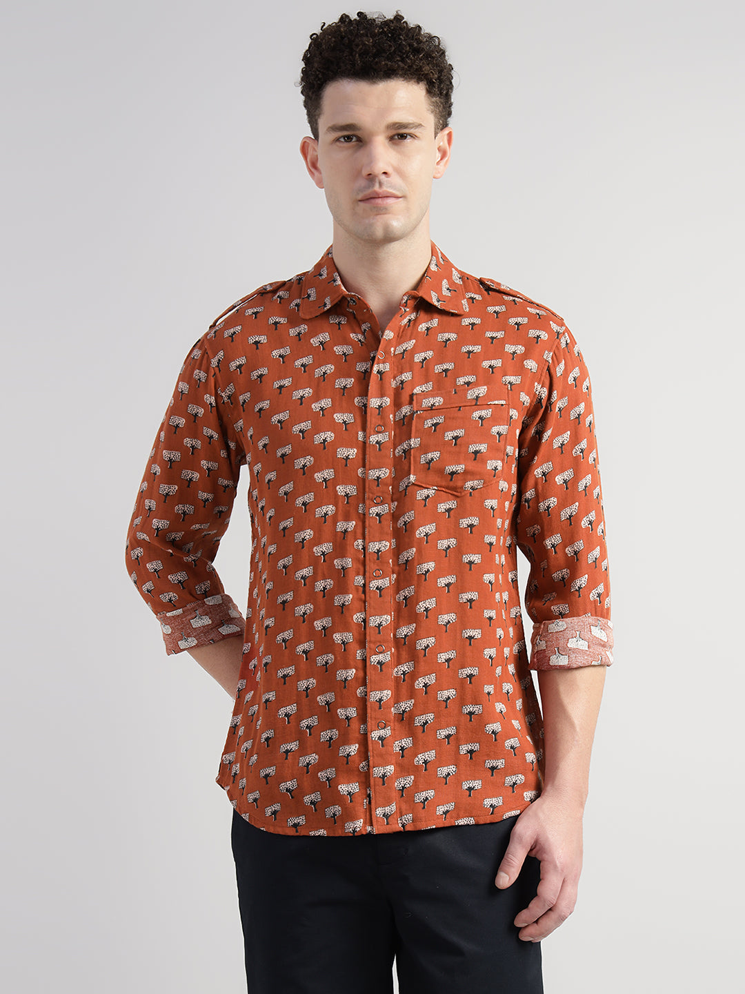 Porsorte Men's Orange Rust Printed Full Sleeve Casual Cotton Shirt