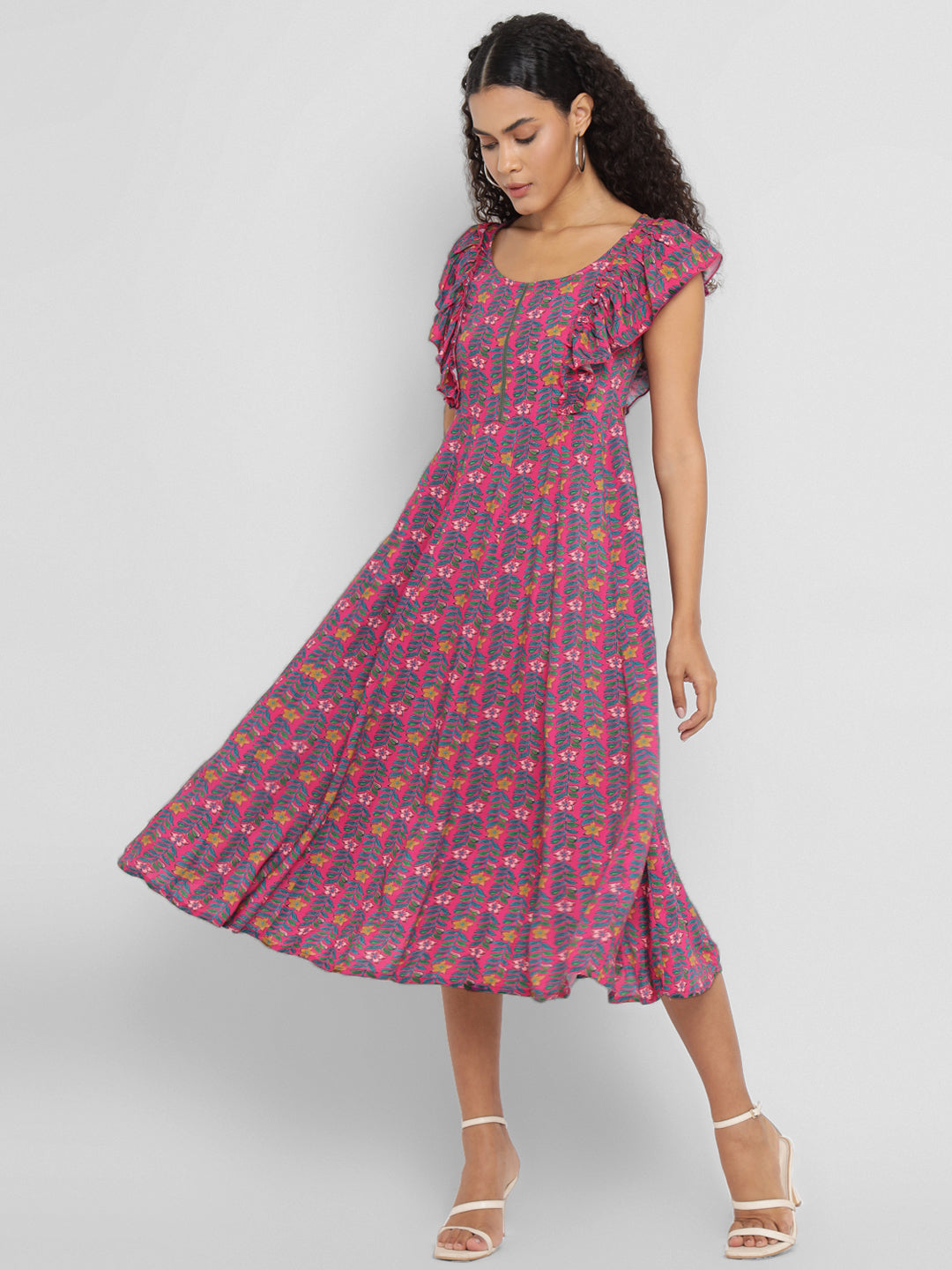 Porsorte Womens Flared Ruffled Sleeve Rayon Printed Magenta Casual Dress