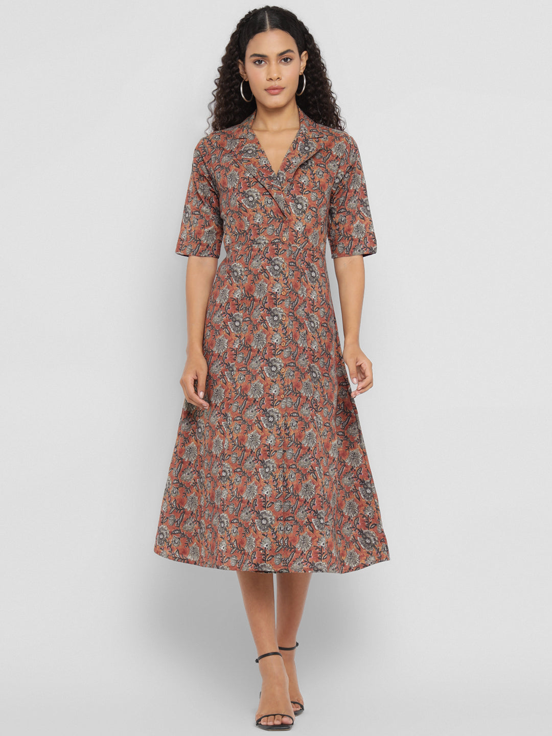 Porsorte Womens Cotton Brown Printed Shirt Midi Dress