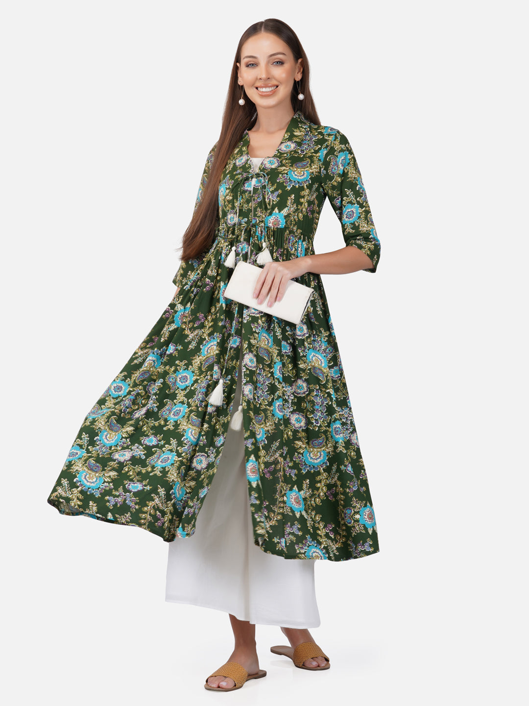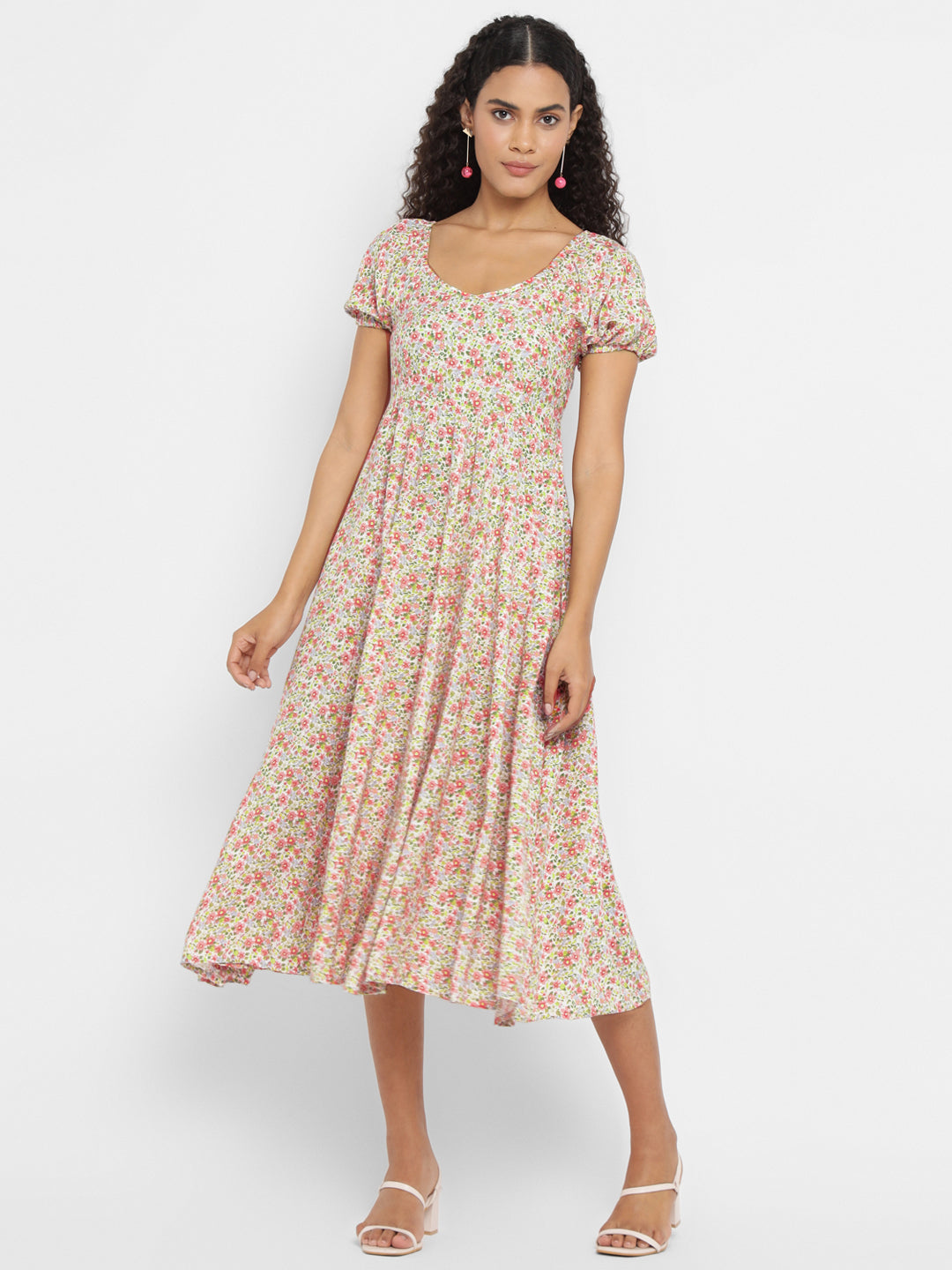 Porsorte Womens Tropical Green Printed Puff Sleeve Midi Dress