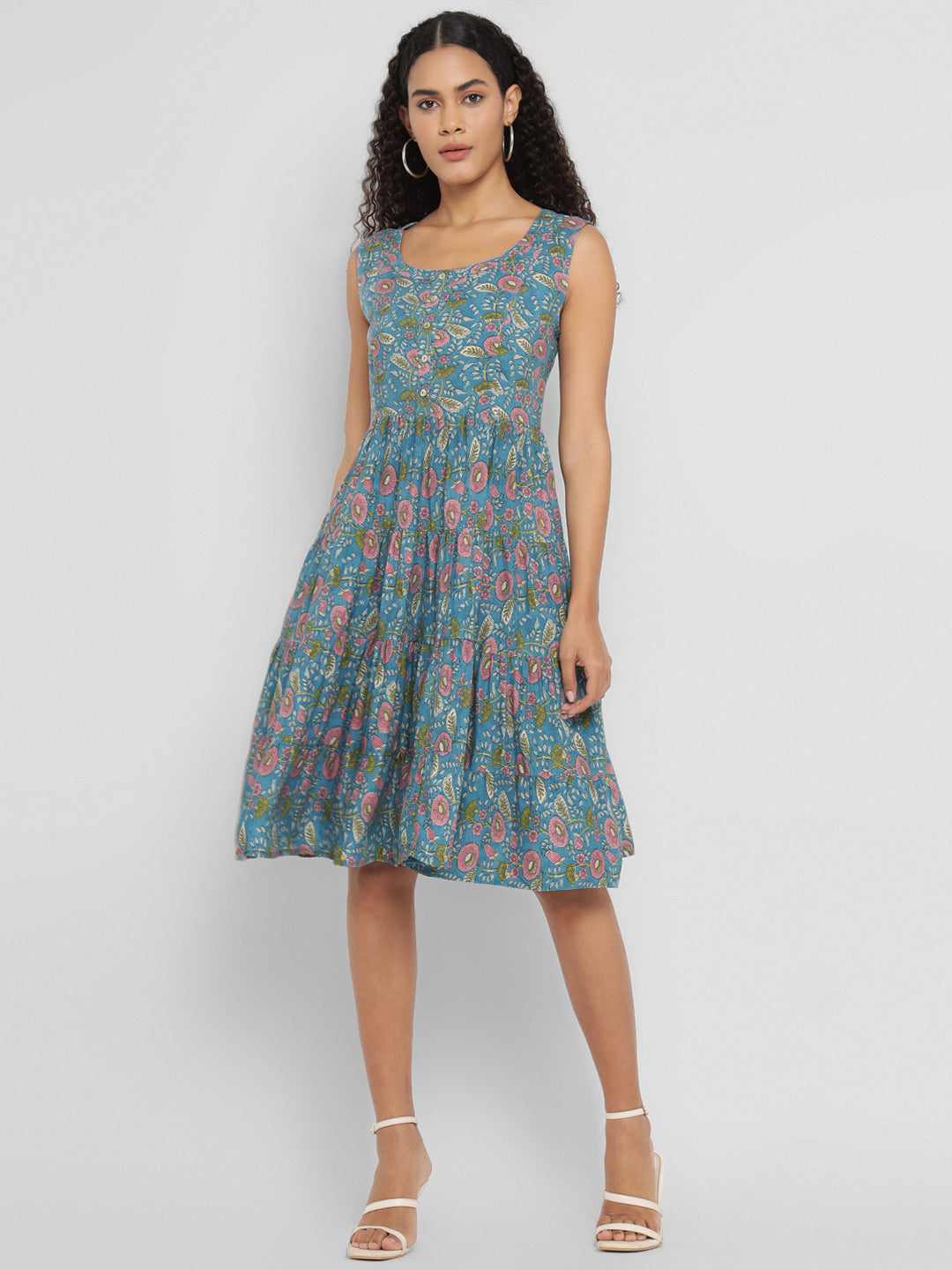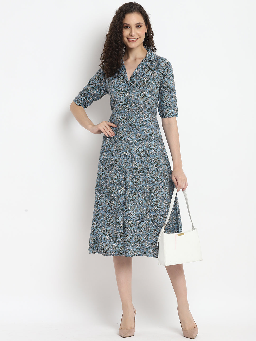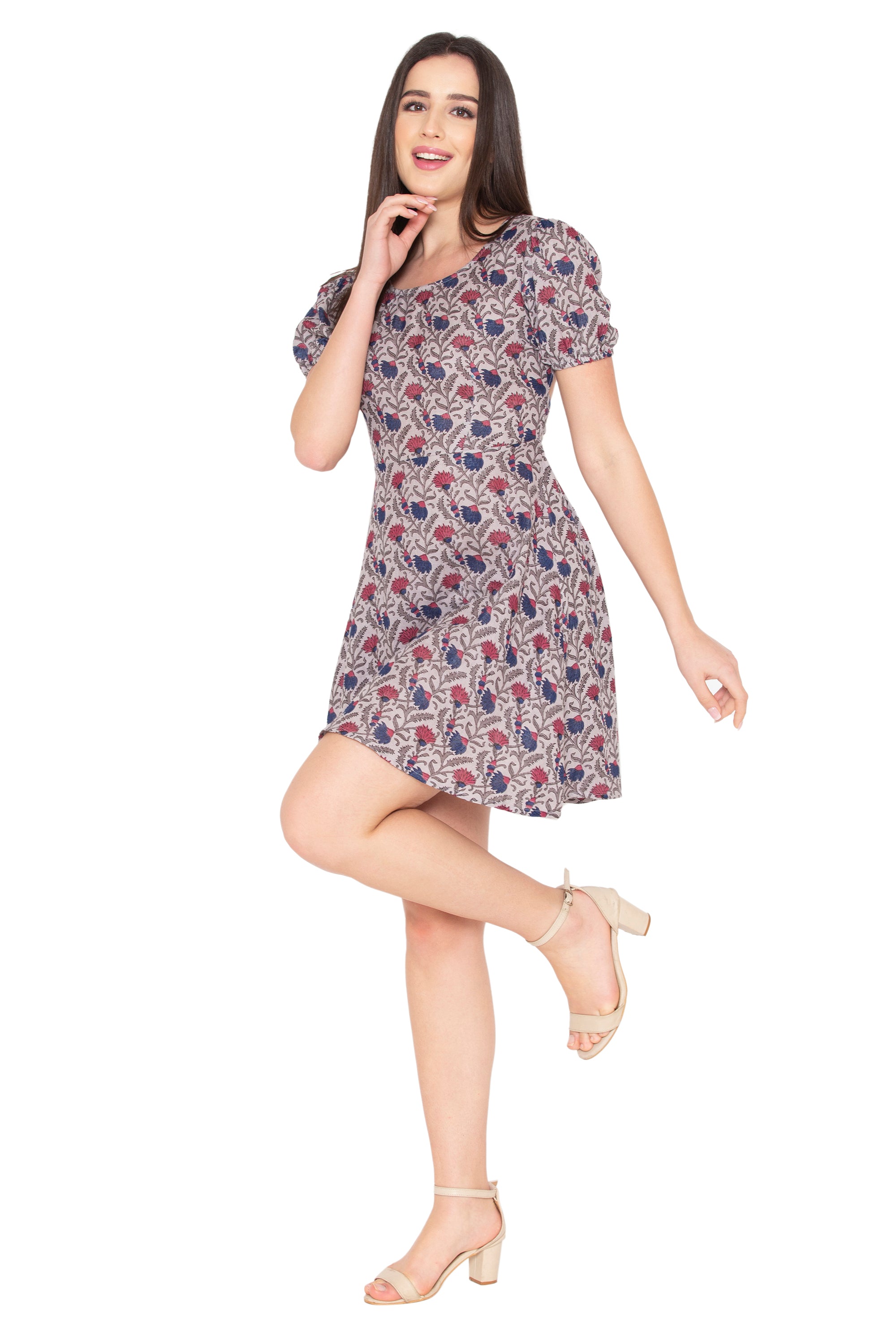 Porsorte Womens Grey Cotton Printed Flared Dress