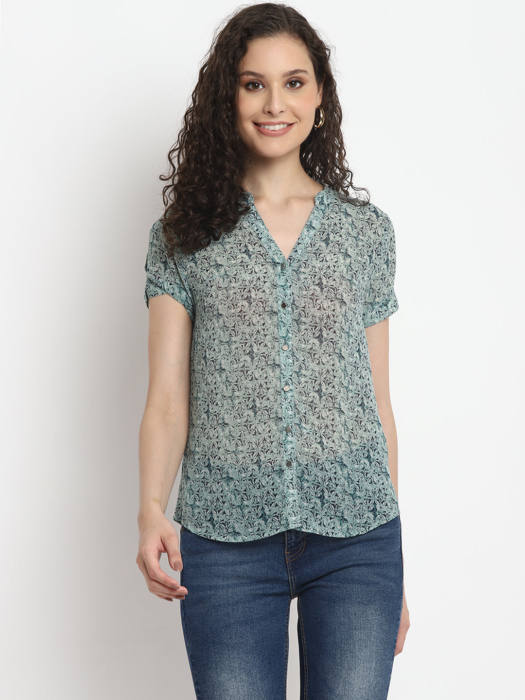 Porsorte Womens Green Printed Short Sleeve Button Down Shirt