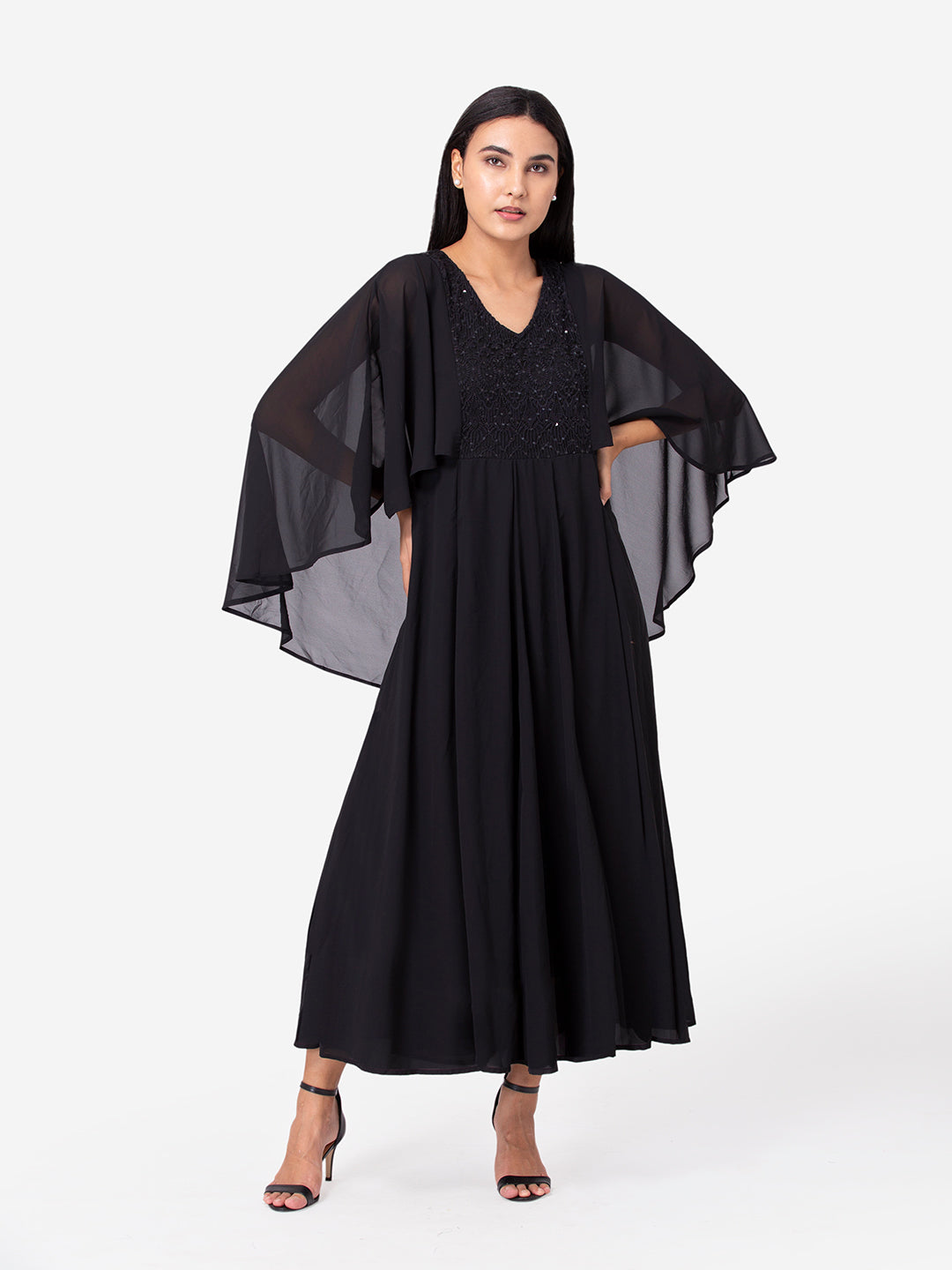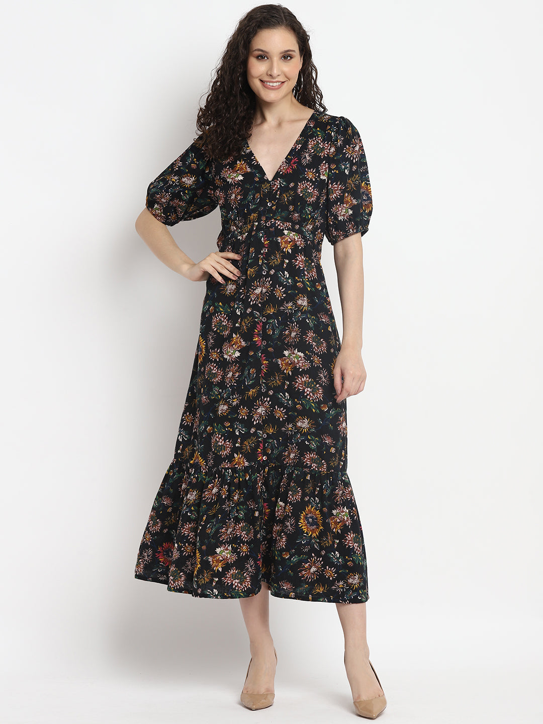 Porsorte Womens Floral Print Black Puff Sleeve Midi Dress