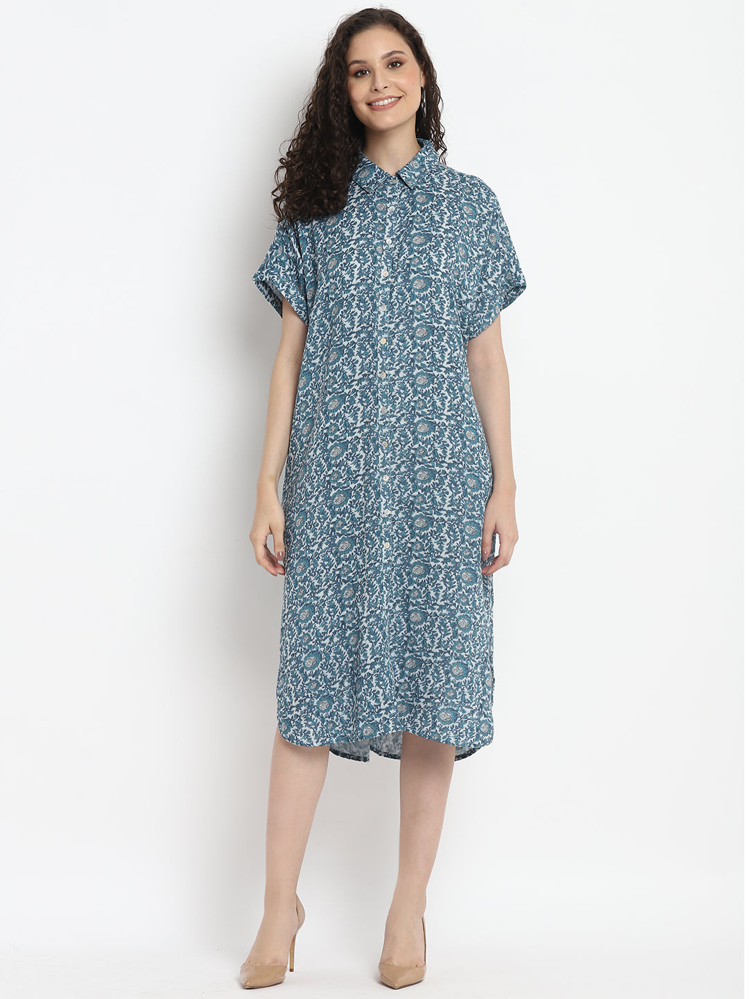 Porsorte Womens Ditsy Print Loose Fit Light Blue Shirt Dress