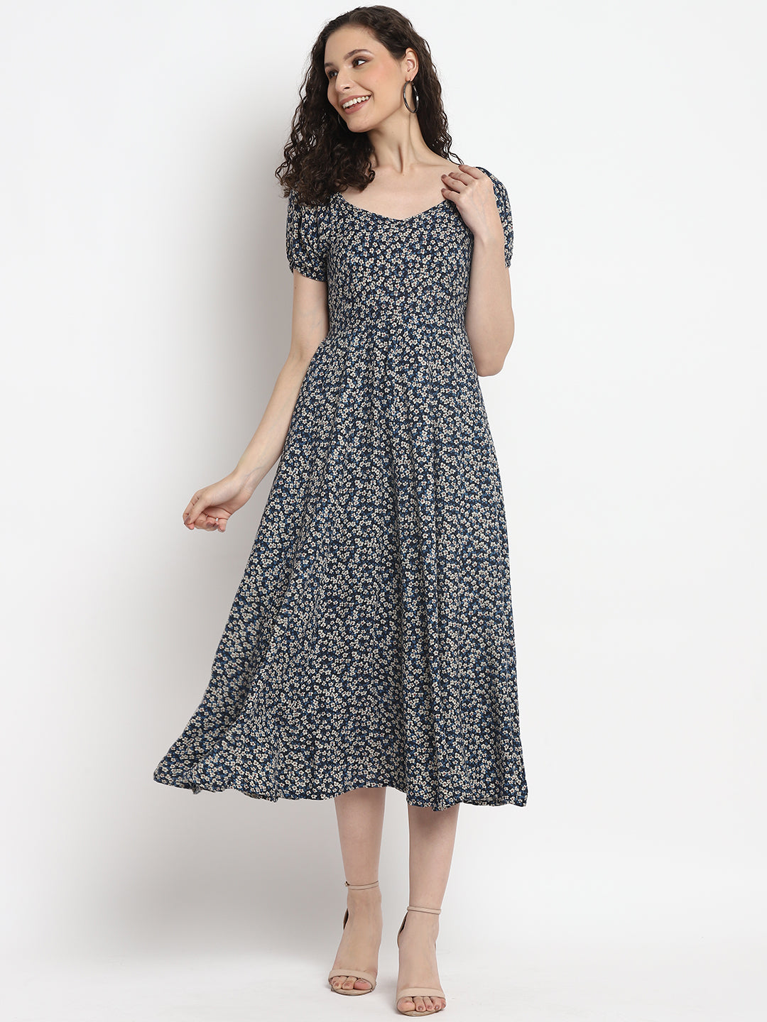 Porsorte Womens Ditsy Print Blue Puff Sleeve Midi Dress