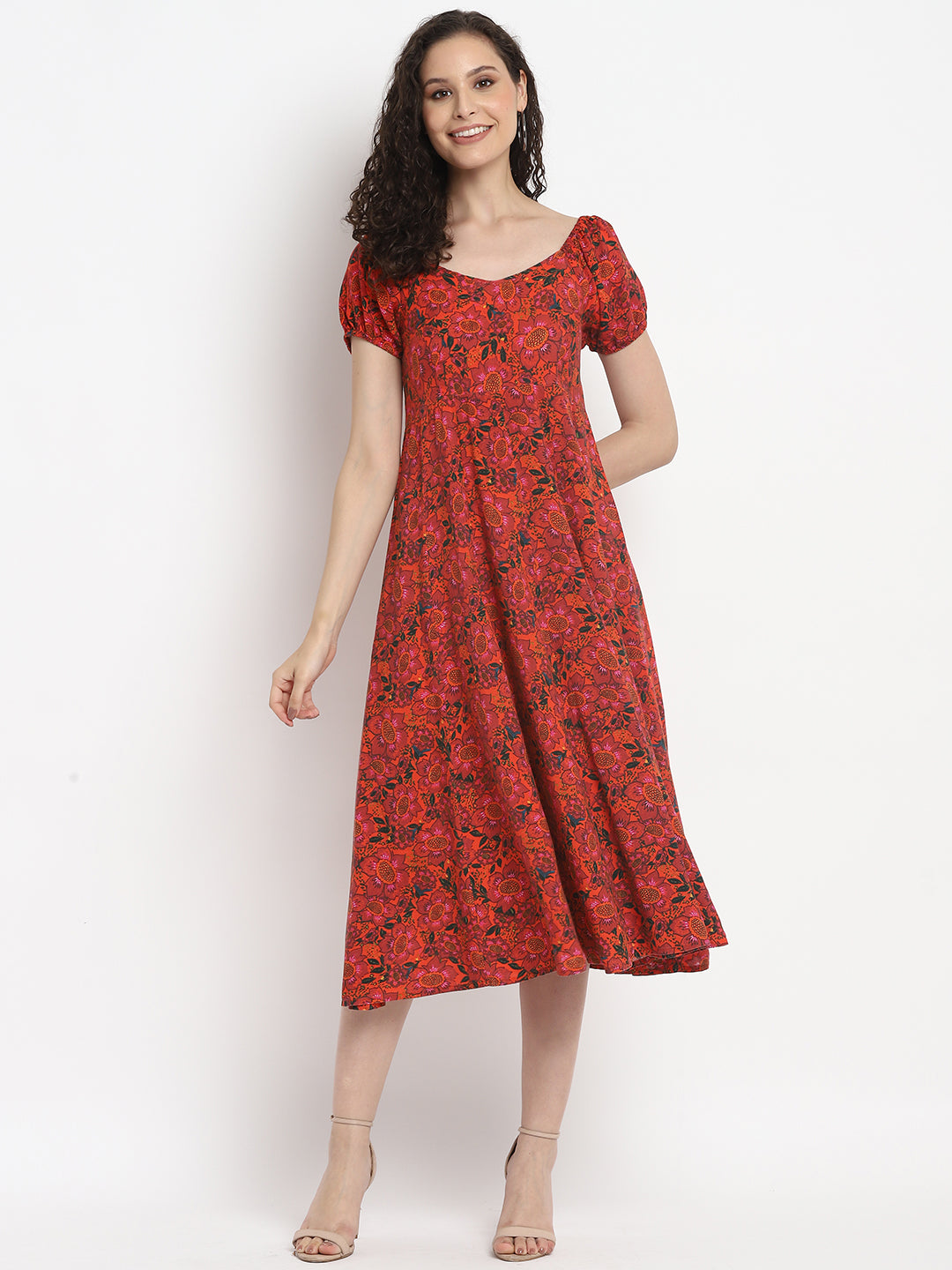 Porsorte Womens Floral Print Red Puff Sleeve Midi Dress