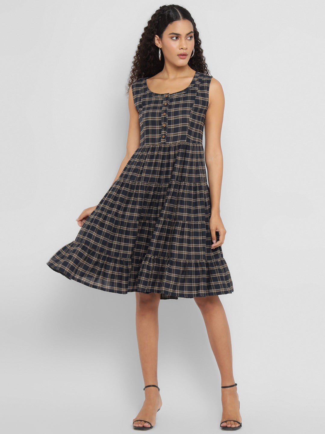 Porsorte Navy Blue & Beige Checked A-Line Sleeveless Midi Dress for Women